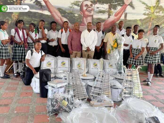 El alcalde de Tadó Juan Carlos Palacios Agualimpia realizó la entrega oficial de una dotación completa de instrumentos musicales que incluye percusión, tambores, liras, bombos y cornetas, al Instituto Técnico Agroambiental (ITA) del municipio de Tadó.