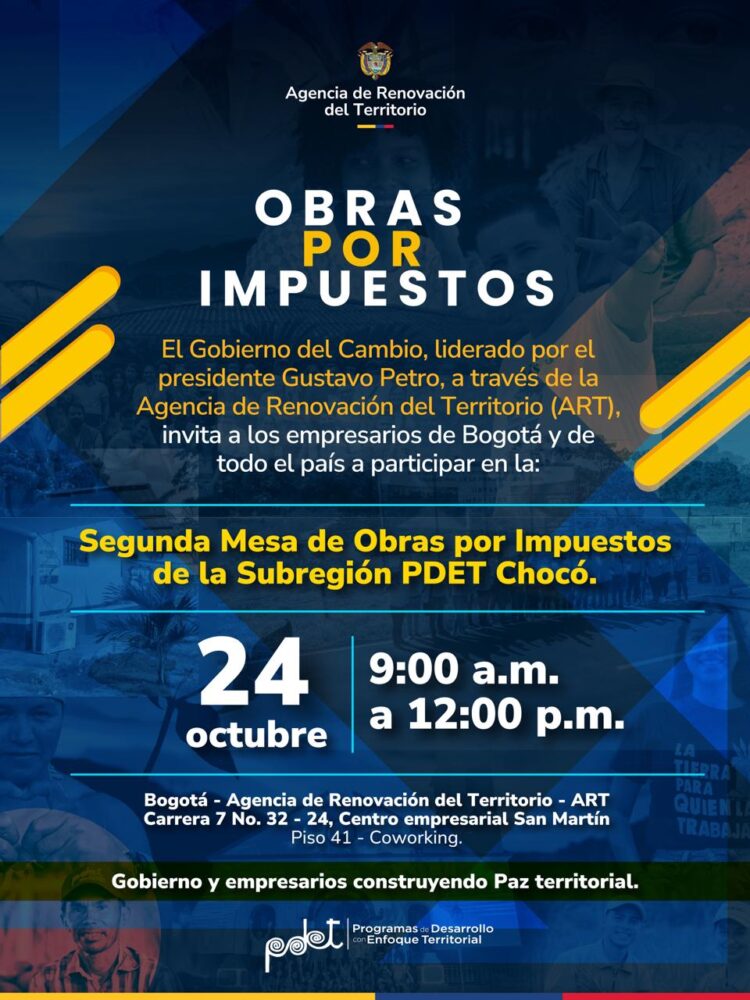 El Gobierno del Cambio, liderado por el presidente Gustavo Petro, a través de la Agencia de Renovación del Territorio (ART), invita a los empresarios de Bogotá y de todo el país a participar en la Segunda Mesa de Obras por Impuestos de la Subregión PDET Chocó y ZOMAC, que se realizará el 24 de octubre, de 9:00 a. m. a 12:00 p. m., en la sede de la ART (Carrera 7 No. 32–24, Centro Empresarial San Martín, piso 41).