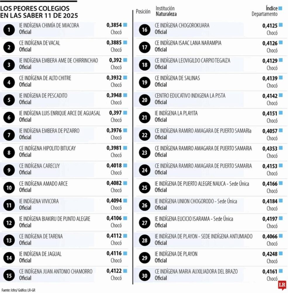 El antiranking muestra que los 30 colegios con puntajes más bajos están concentrados en el departamento del Chocó.