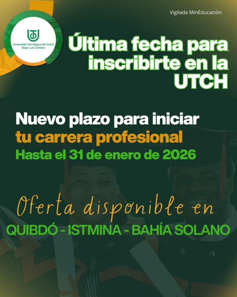 La Universidad Tecnológica del Chocó informa a todos los interesados que, según la Resolución No. 2600 de 2025, el plazo de inscripciones para estudiantes nuevos (periodo 2026-1) finaliza este 31 de enero.