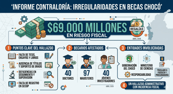 El ente de control determinó un hallazgo administrativo con incidencia fiscal por un valor que, sumado a un caso similar en Magdalena, supera los $69.000 millones de pesos. En el caso específico del Chocó, el proyecto buscaba la formación de capital humano de alto nivel: 40 doctores, 97 magísteres y 40 jóvenes investigadores.