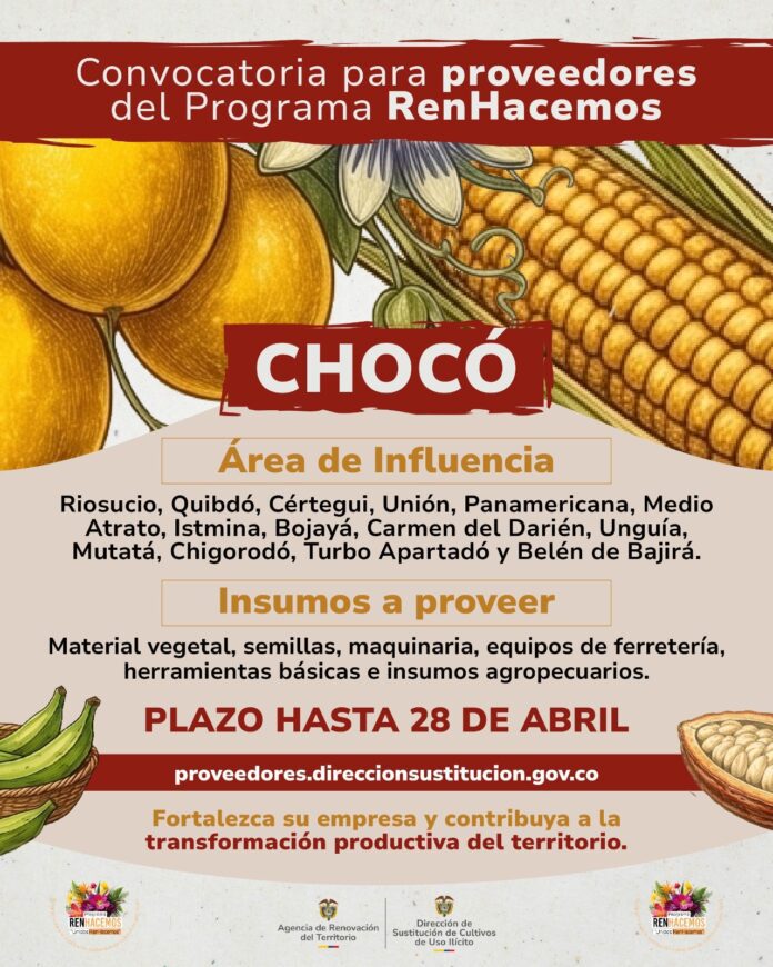 Esta convocatoria está dirigida a proveedores de material vegetal, de semilla, maquinaria, equipos de ferretería, herramientas básicas e insumos agropecuarios que operen en los municipios de Riosucio, Quibdó, Cértegui, Unión, Panamericana, Medio Atrato, Istmina, Bojayá, Carmen del Darién, Unguía y Belén de Bajirá, así como en zonas de influencia mutua como Mutatá, Chigorodó, Turbo y Apartadó.